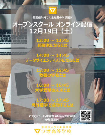 ワオ高等学校は、2021年4月に開校する最新のオンラインハイスクールとして、予測不能な未来に対応した学びを提供するオープンスクール(学び体験会)を2020年12月19日(土)にオンラインにて開催致します。https://www.wao.ed.jp/387/