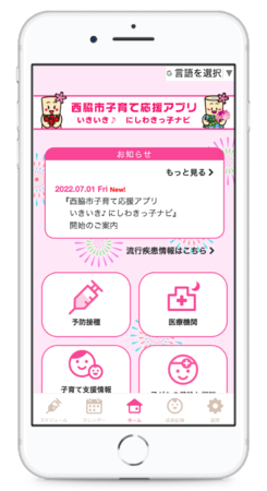 「いきいきと元気に育ってほしい」という想いを込めて、「西脇市子育て応援アプリ いきいき♪にしわきっ子ナビ」と命名しました。西脇市の花「しばざくら」のピンク色をテーマカラーとし、トップページには地域の皆様にも馴染み深いイメージキャラクター「にっしー」「さくら」が登場。西脇市らしさが詰まった、こだわりのデザインでお届けします。