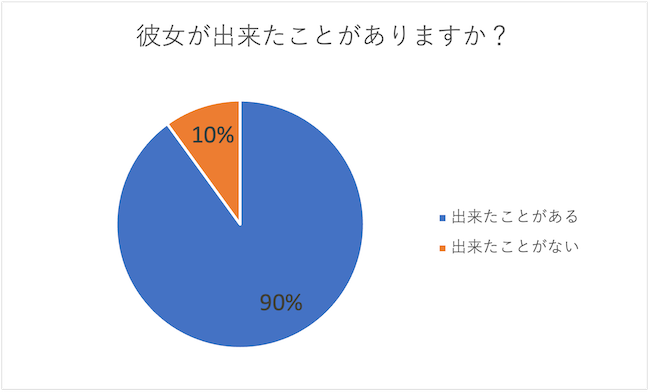 まず、今回の500名に「彼女が出来たことがありますか?」という質問をぶつけました。すると、90%の男性が「出来た事がある」と回答。年齢差はありますが、世の男性の8~9割近くは、彼女が出来た経験があると推測出来ます。