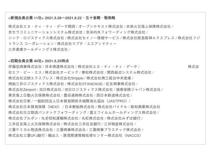 貿易情報連携プラットフォーム「TradeWaltz」を運営する株式会社トレードワルツ(以下:トレードワルツ)は、2021年5月25日新規会員募集を発表した「貿易コンソーシアム」へ、1カ月で新たに物流企業やITベンダー11社が加わり、計51社となりましたので、ご報告を致します。