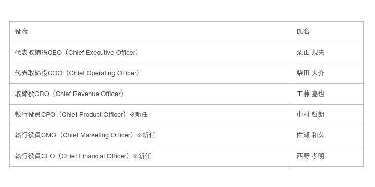代表者 :代表取締役 CEO 栗山規夫 代表取締役 COO 柴田大介