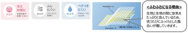 マシュマロガーゼはタオルの製造技術を最大限に駆使して開発した特殊なガーゼで、平織り織機で製造される一般的なガーゼと異なります。3層になった生地と生地の間に空間をつくり、生地の中に空気をたっぷりと含ませているため、驚くほど軽くやわらかで、洗うたびにふわふわ感が増す風合いが特徴です。さらに保温性、通気性、また吸水性をバランスよく兼ね備え、衣服内の環境を快適に保ってくれます。素材は厳選した綿100%で、パジャマ、ベビーアイテム、リラクシングウェアなど多くの製品を展開しています。刺激が少なく優しい肌触りから、多くの製品が日本アトピー協会の推薦品となっています。