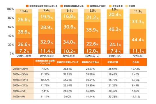 「最低限で良い」「投資は不要」と回答した人の比率は年代が上がるにつれて徐々に多くなっていることがわかります。