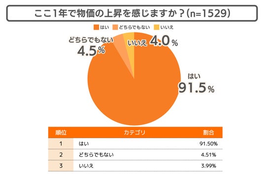 直近1年で物価の上昇を感じている人は90%以上でした。