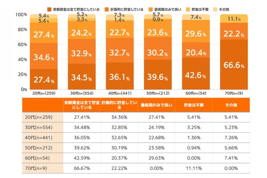 特に70代は60%以上が「余剰資金は全て貯金にする」と回答しており、60代も40%以上とその割合が高くなっています。