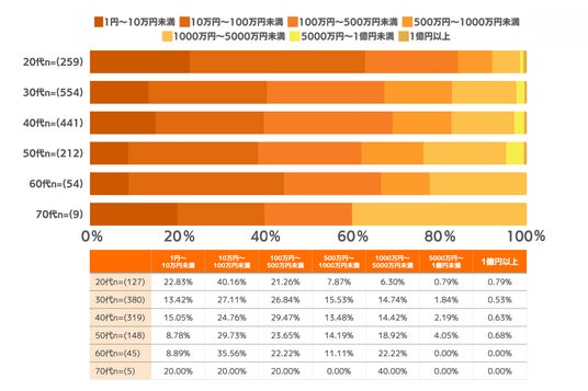 60代では10万円~100万円が35%と回答した方が最多で、次に1000万円~5000万円が約22%と多いいということから、高齢層では保有金融資産の二極化が進んでいるとも言えます。