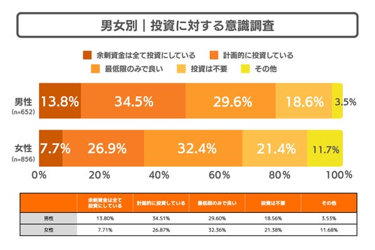 計画的に投資している人は男性で34%、女性で26%という結果になりました。