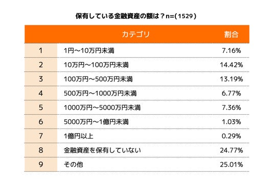 保有している金融資産の額で1番多いのは10万円~100万円未満で14%程度の方が該当すると回答しました。
