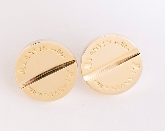 かぶせ前面の生地リボンはロゴが刻まれたゴールドのボタン鋲に付け替えられます。