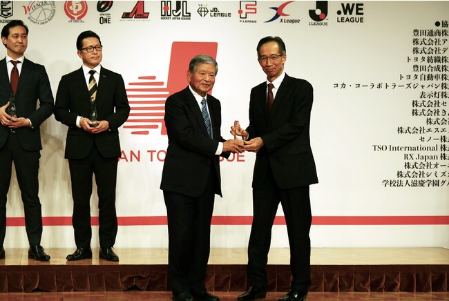 (↑日本トップリーグ連携機構 川淵三郎代表理事会長 (左)からトロフィーを受け取る玉上進一代表(右))