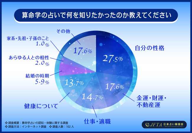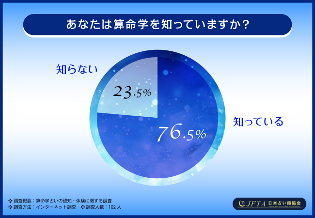 そこで今回、算命学資格認定試験(https://www.uranai.org/sanmei/)を主催する日本占い師協会(https://www.uranai.org/)は、全国の男女102名を対象に、「算命学占いの認知・体験」に関する調査を実施しました。