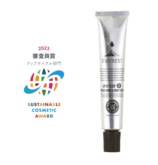 オーガニックコスメの専門家から環境問題の専門家、ジャーナリスト、Z 世代の環境活動アクティビストなどで構成される審査員による審査の結果、ありとあらゆる日常生活の出来事、目に映るものを ‘regeneration -再生-‘ していくストリートコスメブランド「EVEREST」の日本初となるコーヒーの搾りかすをアップサイクルし原料とするコスメ「エベレストエシカルハンド&ボディクリーム/コーヒー」が、サステナブルコスメアワード2023のアップサイクル部門で「審査員賞」を受賞しました。