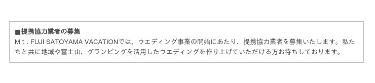 一般社団法人エコロジックが運営するグランピング施設「Mt. FUJI SATOYAMA VACATION(マウントフジ里山バケーション)」では、グランピング宿泊と併せて、お客様の希望に沿った様々なプログラムをご用意しております。今回、宿泊もできるウエディング・グランピングサイトとしての利用を開始いたします。今後のウエディング展開にご注目ください。