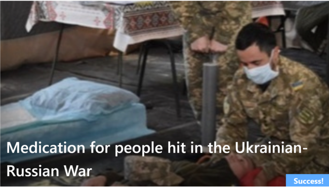 日本語訳:「ウクライナ・ロシア間の戦争被災者へ医薬品を」