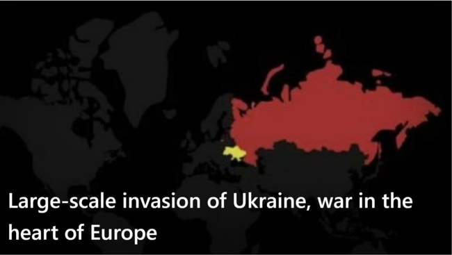 日本語訳:「ウクライナへの大規模侵攻・ヨーロッパの中心で紛争勃発」