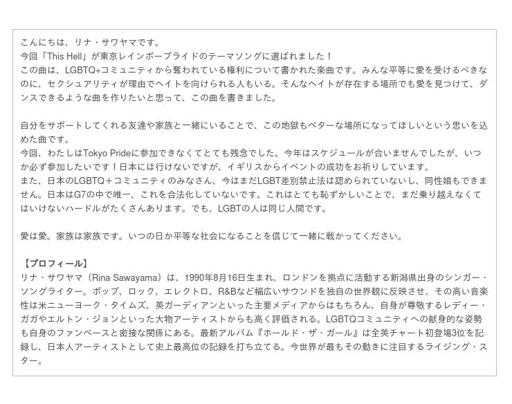 4月23日(日)に代々木公園にて開催する「東京レインボープライド2023」(以下、TRP2023)のテーマ曲として、リナ・サワヤマさんの「This Hell」を起用することが決定いたしました。