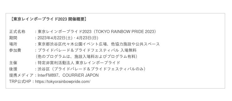 特定非営利活動法人 東京レインボープライド(共同代表理事:杉山文野、山田なつみ) は、 4月22日(土)・
