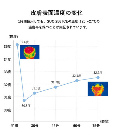 国内検査機関でSUO 256 ICE METを検証しました。1時間使用しても、SUO 256 ICE METの温度は25~27℃の温度帯を保つことが実証されています。