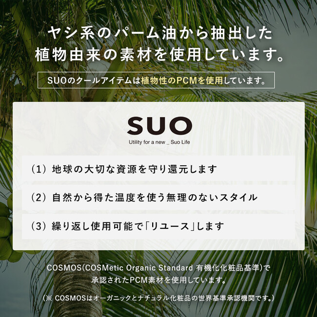 SUO 256 ICE MET とSUO 256 ICE CAPは、ヤシ系のパーム油から抽出した植物由来のPCMを使用しています。