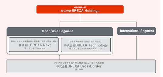 2025年7月1日より、株式会社BREXA Holdingsを純粋持株会社として、ホールディング体制に移行します。国内においては2025年7月1日付で、株式会社BCJ-78が株式会社BREXA Holdingsに、当社が株式会社BREXA Nextに、株式会社アウトソーシングテクノロジーが株式会社BREXA Technologyに、株式会社ORJが株式会社BREXA CrossBorderに商号変更を予定しており、以下の体制へ変更いたします。