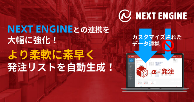今回の連携強化により、より素早く柔軟に「NEXT ENGINE」のデータを「α-発注」に連携できるようになりました。