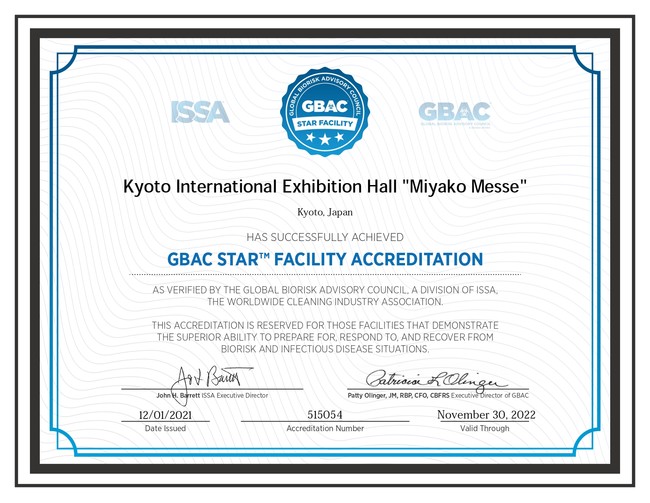 京都市勧業館みやこめっせ(運営:株式会社京都産業振興センター、所在地:京都市左京区、以下みやこめっせ)は、お客さまに安全・安心な施設環境をお届けするため、感染症予防対策において、国際的な衛生基準を満たした施設であることを証明する、GBAC STAR(TM) Facility Accreditation(以下「GBAC STAR(TM)認証」)を取得いたしました。