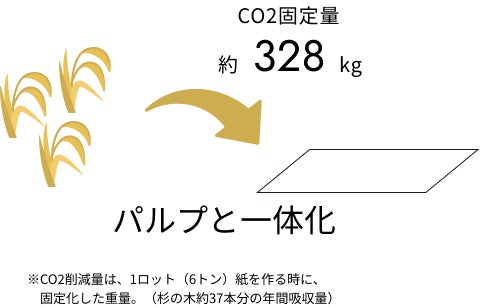 また、お米をパルプと一体化させることで約328kg(杉の木約37本が1年間に吸収する量)のCO2を固定化しています。(※1)