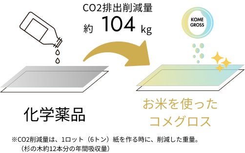 通常、紙の表面には、強度と発色を向上させるために薬品が塗られています。今回、この一部の薬品をお米に代替した「コメグロス」の塗工に成功。その結果、1ロット(6トン)製造時の排出量を、約104kg(杉の木約12本が1年間に吸収する量)削減させることができました。