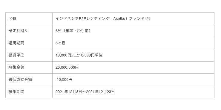 本ファンドは、インドネシア国内にて資金を借りたい個人および法人と、資金を運用したい個人および法人とをつなげるマッチングサービス(P2Pレンディング)サイト「Asetku」を利用する借り手ユーザーに対する貸付事業を資金使途とする貸付型ファンドです。