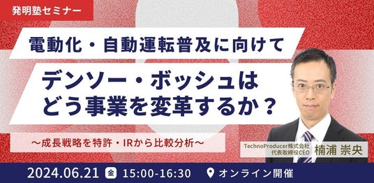 TechnoProducer(テクノプロデューサー)株式会社(代表取締役:楠浦崇央)は、2024年6月21日(金)15時から「発明塾セミナー:電動化・自動運転普及に向けてデンソー・ボッシュはどう事業を変革するか? ~成長戦略を特許・IRから比較分析~」を開催致します。