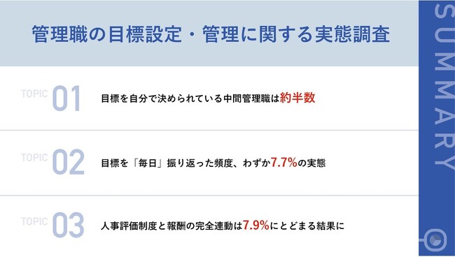 今回の調査によれば、目標を毎日振り返っている管理職はわずか7.7%という実態や評価・報酬(基本給)連動に関して、人事評価制度と報酬の完全連動はわずか7.9%という実態となっています。目標管理と人事評価を行えていない実態は企業の生産性を向上させる課題の一つと言えるでしょう。