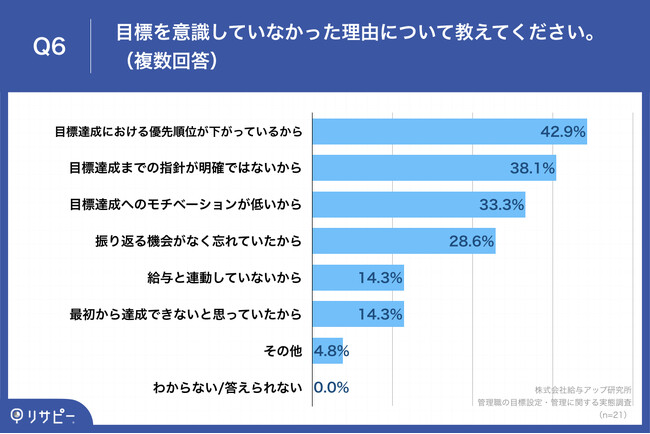 Q5で「期中に目標を意識できていなかったから」と答えた方に、「Q6.目標を意識していなかった理由について教えてください。(複数回答)」(n=21)と質問したところ、「目標達成における優先順位が下がっているから」が42.9%、「目標達成までの指針が明確ではないから」が38.1%、「目標達成へのモチベーションが低いから」が33.3%という回答となりました。
