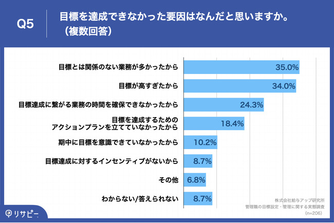Q4で「やや未達成だった」「大幅に未達成だった」と回答した方に、「Q5.目標を達成できなかった要因はなんだと思いますか。(複数回答)」(n=206)と質問したところ、「目標とは関係のない業務が多かったから」が35.0%、「目標が高すぎたから」が34.0%、「目標達成に繋がる業務の時間を確保できなかったから」が24.3%という回答となりました。