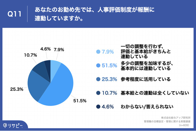 「Q11.あなたのお勤め先では、人事評価制度が報酬に連動していますか。」(n=609)と質問したところ、「一切の調整を行わず、評価と基本給がきちんと連動している」が7.9%、「多少の調整を加味するが、基本的には連動している」が51.5%という回答となりました。