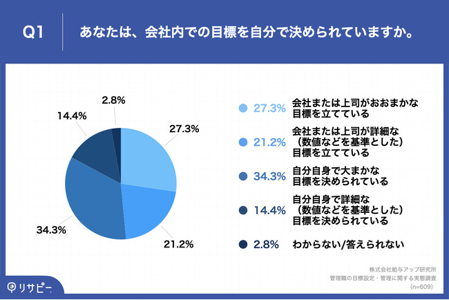 「Q1.あなたは、会社内での目標を自分で決められていますか。」(n=609)と質問したところ、「自分自身で大まかな目標を決められている」が34.3%、「自分自身で詳細な(数値などを基準とした)目標を決められている」が14.4%という回答となりました。
