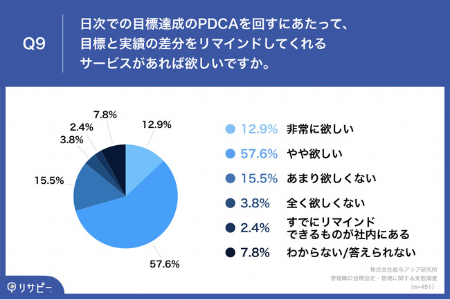 Q8で「非常にそう思う」「ややそう思う」と回答した方に、「Q9.日次での目標達成のPDCAを回すにあたって、目標と実績の差分をリマインドしてくれるサービスがあれば欲しいですか。」(n=451)と質問したところ、「非常に欲しい」が12.9%、「やや欲しい」が57.6%という回答となりました。