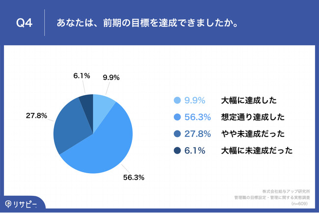 「Q4.あなたは、前期の目標を達成できましたか。」(n=609)と質問したところ、「大幅に達成した」が9.9%、「想定通り達成した」が56.3%という回答となりました。