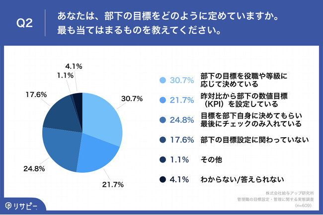 「Q2.あなたは、部下の目標をどのように定めていますか。最も当てはまるものを教えてください。」(n=609)と質問したところ、「部下の目標を役職や等級に応じて決めている」が30.7%、「目標を部下自身に決めてもらい最後にチェックのみ入れている」が24.8%という回答となりました。