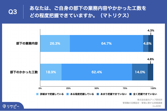 「Q3.あなたは、ご自身の部下の業務内容やかかった工数をどの程度把握できていますか。(マトリクス)」(n=609)と質問したところ、部下の業務内容は「詳細まで把握している」が26.3%、「ある程度把握している」が64.7%、部下のかかった工数は「詳細まで把握している」が18.9%、「ある程度把握している」が62.4%という回答となりました。