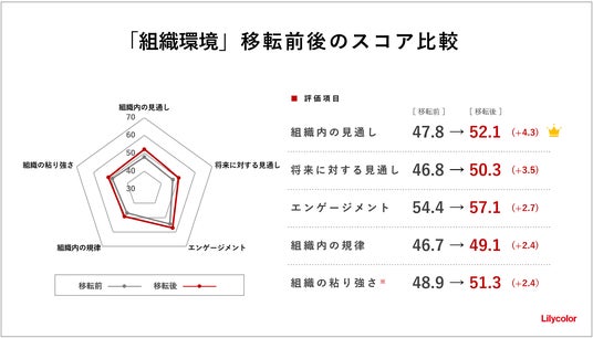 組織環境(Organization)においては、すべての項目でバランスよくスコア(偏差値)が改善。全体的にポジティブな変化が見られ、組織の活力と結束力が強化されたことが示唆されている。この結果から、今回のオフィス移転が組織環境改善へ効果をもたらしたことが読み取れる。