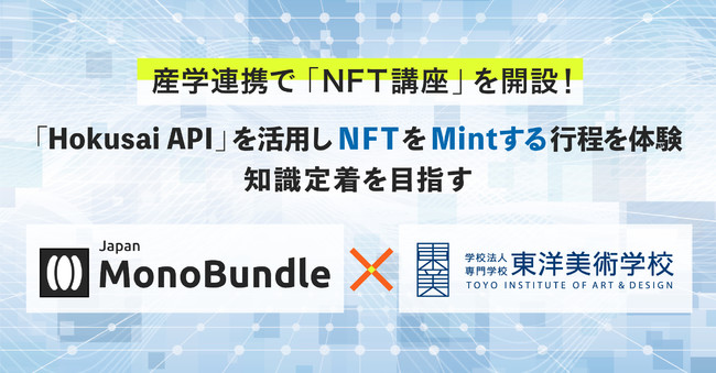 NFTのインフラサービス「Hokusai API」を提供する日本モノバンドル株式会社(千葉県、代表取締役:原沢陽水)は、学校法人専門学校 東洋美術学校(東京都、校長:中込三郎)と産学連携の取り組みとして「NFT講座」を開講することを発表します。日本モノバンドル株式会社は、次世代を担う日本のクリエイターに対し、NFTに対する適切な理解と知識の定着を目的とした活動に取り組みます。