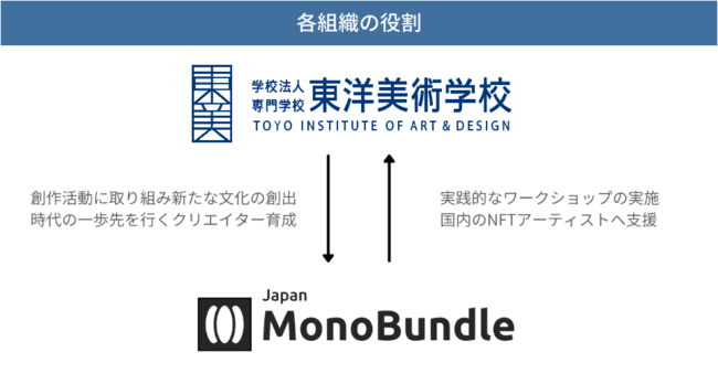 事業者や開発者のNFTサービス開発コストを大幅に下げるNFTインフラ「Hokusai API」を提供する日本モノバンドル株式会社は、この度、東洋美術学校と産学連携の取り組みとして「NFT講座」を開設します。本件の連携により、日本の学生に対し、NFTに関するあらゆる観点からの理解と知識の定着を目指します。本講座を受講した学生がNFTを活用した創作活動に取り組み、新たな文化の創出に貢献できるような取り組みといたします。