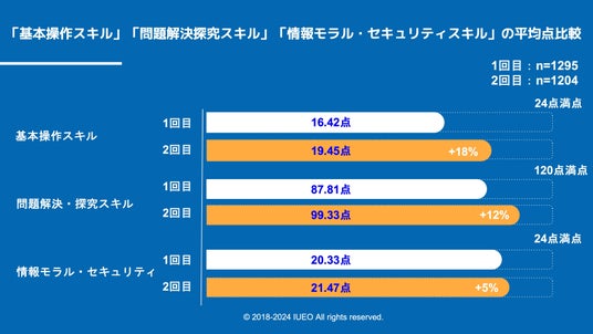 1回目の診断に比べて「基本操作スキル」18%の向上、「問題解決・探究スキル」が12%向上、「情報モラル・セキュリティスキル」が5%向上
