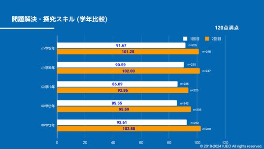 また、問題解決・探究スキルをさらに細分化した項目についても、「課題の設定」が15%、「情報の収集」が12%、「整理・分析」が16%、「まとめ・表現」が16%、「振り返り・改善」が12%の向上が見られました。