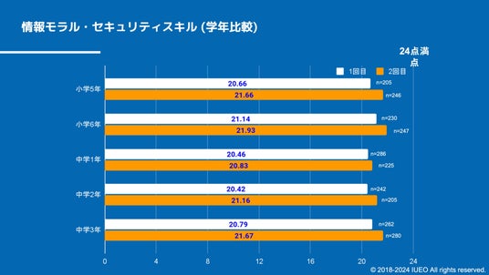 情報モラル・セキュリティスキルについても同様の傾向が見られる。1回目に比べて、2回目のスコアが高い。また、発達段階に合わせて情報活用能力が高くなるという傾向は見られない。