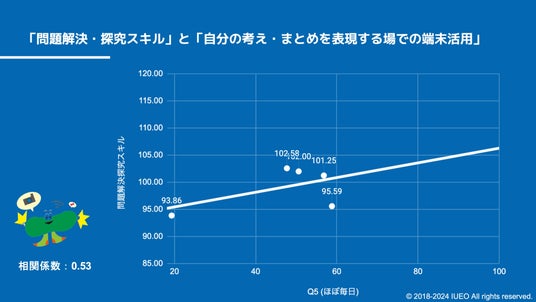 「自分の考えやまとめを表現する場」での端末活用を積極的に行っている学年ほど、情報活用能力における「問題解決・探究スキル」が高い傾向。
