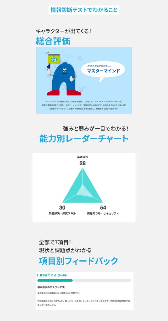 「ジョーカツ」とは、小学生から中学生までの教育課程においてPCやタブレット、インターネット活用を軸とした情報活用能力を診断することができます。本診断は、文部科学省が提示する情報活用能力体系表例※6に基づき、情報活用能力における3つの大枠(1.基本操作、2.問題解決・探究スキル、3.情報モラル・セキュリティ)で構成されています。全28問の質問に回答すると、回答内容に応じて診断結果及びキャラクターが表示されます。