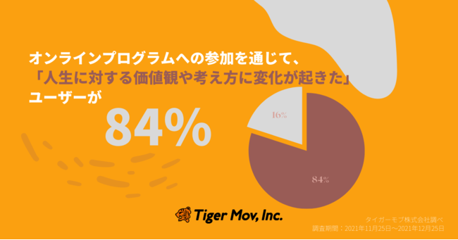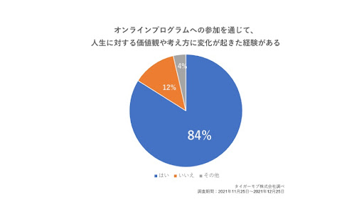 オンラインプログラムへの参加を通じて、「人生に対する価値観や考え方に変化が起きた」ユーザーが84%