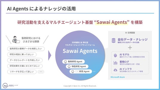 製剤研究の現場では「蓄積データの検索」や「レポート作成」など多様な課題が存在します。本プロジェクトでは、膨大なデータを最大限に活用し「ベテラン研究者に相談できるAI」を目指して、業務特化Agent を Microsoft Azure(以下、Azure) の AI 基盤で一元管理するプラットフォームを開発しました。