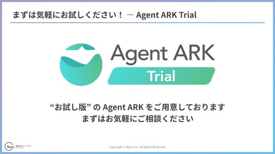 現在、外部公開されている製剤データを取り込んだ特化型 Agent のサンプルをお試しいただける無償の「Agent ARK Trial」を提供しており、開発費用をかけずにナレッジ活用の具体的なイメージを掴んでいただくことが可能です。